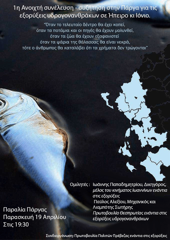 Συνέλευση – συζήτηση στην Πάργα 16 Απριλίου, 201929 Ιανουαρίου, 2024NEA, ΔΕΛΤΙΑ ΤΥΠΟΥ, ΗΠΕΙΡΟΣ ΣΥΝΕΧΙΖΟΥΜΕ ΜΕΧΡΙ ΝΑ ΕΝΗΜΕΡΩΘΕΙ ΟΛΟΣ Ο ΚΟΣΜΟΣ ΓΙΑ ΤΗ ΛΑΙΛΑΠΑ ΤΩΝ ΕΞΟΡΥΞΕΩΝ ΣΕ ΗΠΕΙΡΟ ΚΑΙ ΙΟΝΙΟ Παραλία Πάργας, Παρασκευή 19 Απριλίου στις 19:30